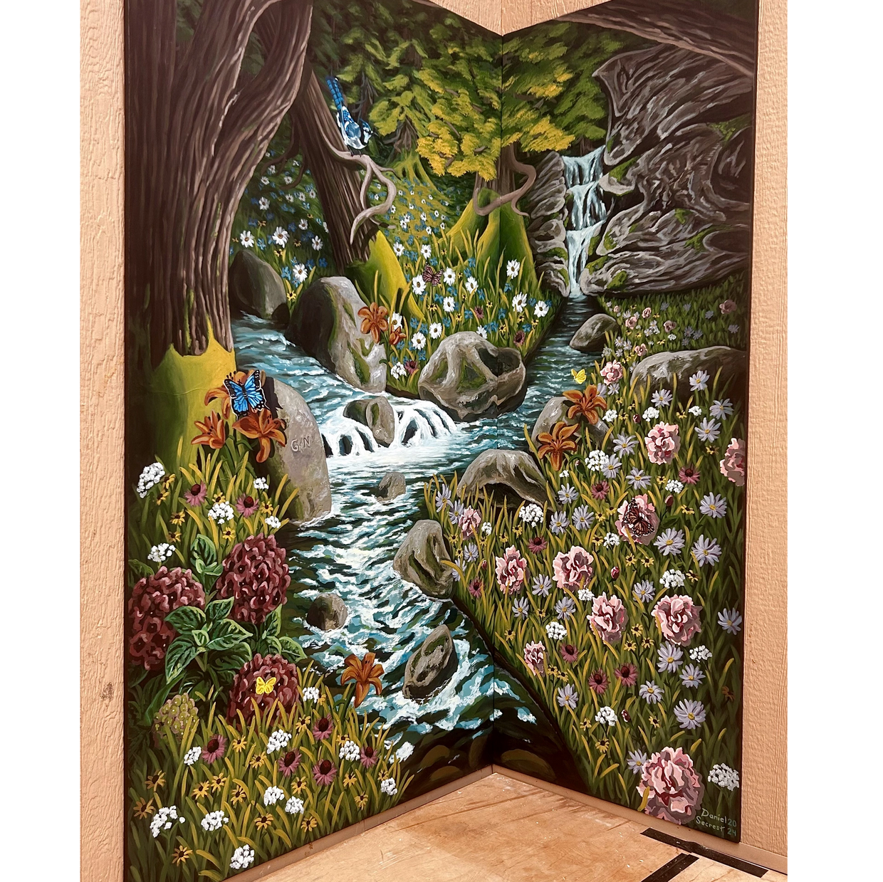 This mural was constructed on two high density pieces of plywood, using outdoor grade acrylic paint. The left panel pictured is 7ft x 4ft and the right is 7ft x 2.5ft. Summer of 2024.